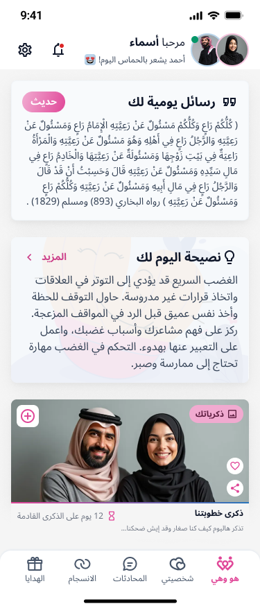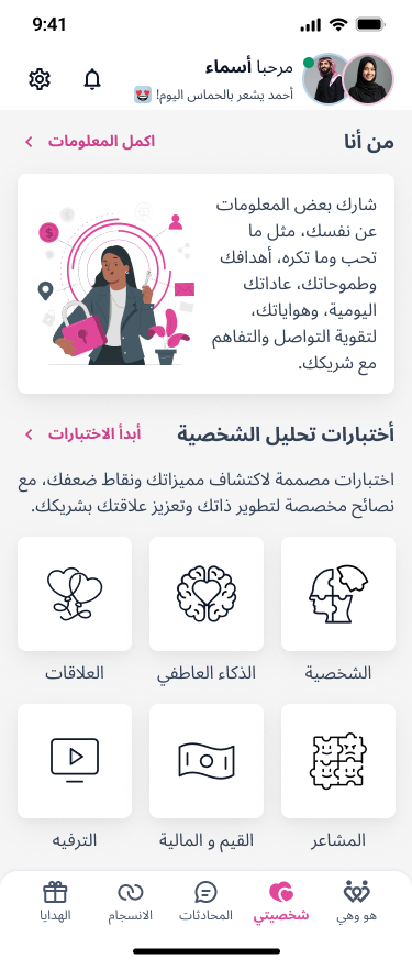 “هو وهي” هو تطبيق ذكي ومميز مصمم خصيصًا للأزواج والمخطوبين، بهدف تقوية العلاقة بينهم بطريقة ممتعة وعاطفية. من خلال مجموعة من الأسئلة اليومية، والدردشة الخاصة، وتسجيل الذكريات، ومشاركة الهدايا، يخلق التطبيق مساحة آمنة ومليئة بالحب تساعد الطرفين على التواصل العميق، فهم بعضهم بشكل أفضل، وكسر الروتين اليومي بلحظات بسيطة لكن مؤثرة. سواء كنتم في بداية العلاقة أو بقالكم سنين مع بعض، “هو وهي” بيقربكم أكتر كل يوم.